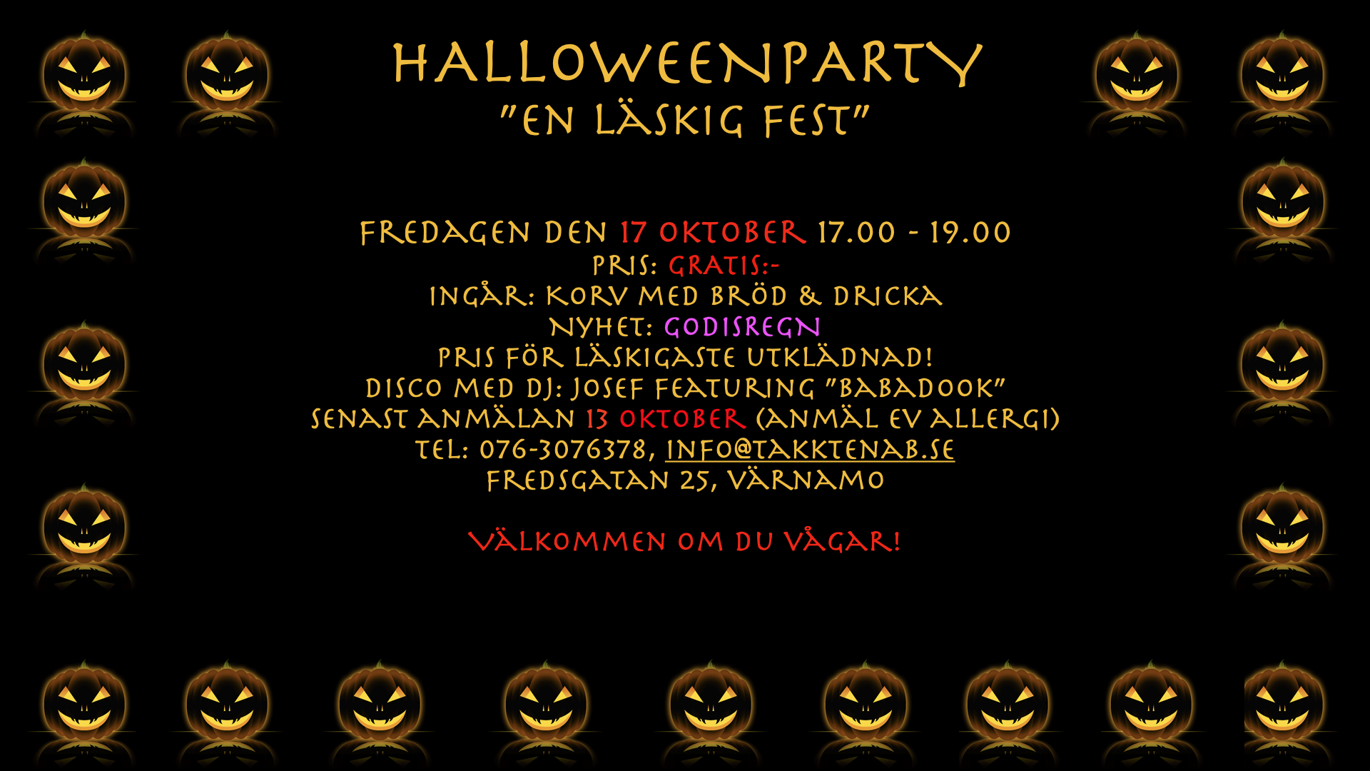 ÄNTLIGEN……..Väntan är över!!! Fredagen den 17:e oktober har vi vår årliga HALLOWEEN fest.Välkommen till Takkten på Fredsgatan 25, kl 17.00-19.00. Även i år har vi gratis inträde. Vi bjuder på korv med bröd och dricka (anmäl ev allergi).Nyhet för i år är GODISREGNET. Pris till bästa Halloween utklädnad. Disco och dans till DJ JOSEF featuring BABADOOK. Senaste anmälan är 13:e oktober på tel: 076-3076378 eller info@takktenab.seVÄLKOMMEN OM DU VÅGAR…….hahahaha…………..