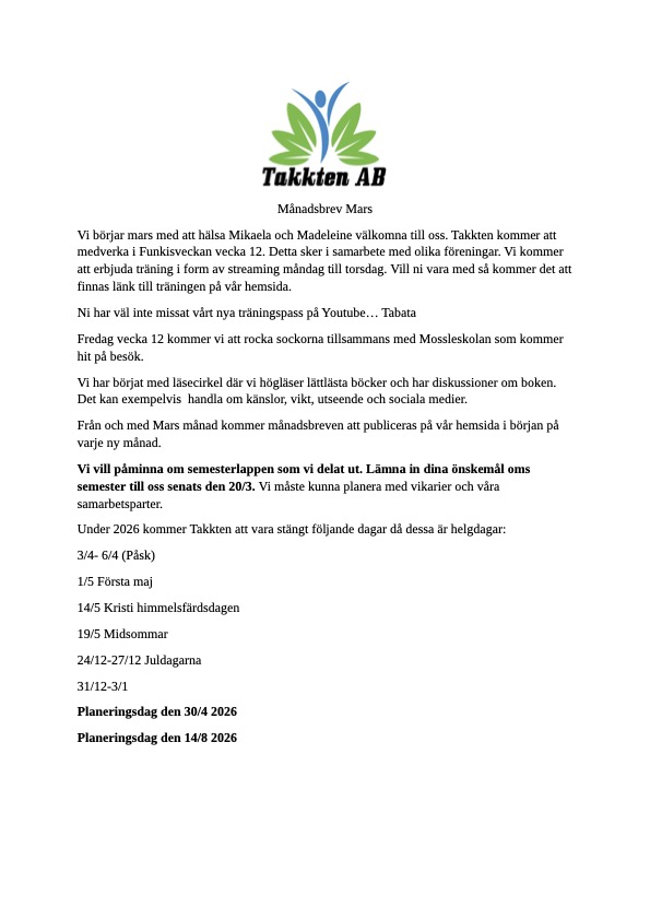 Takkten AB är en daglig verksamhet inom LSS som arbetar för utveckling av individens egna förmågor. Med kommunikation i centrum så tillhandahåller vi många olika aktiviteter och arbetsuppgifter. Vi har även ett stort fokus kring Hälsa & motion. Genom samarbeten med lokala företag och aktörer når våran verksamhet ut i samhället. Musik, dans och annat skapande förgyller även våra dagar. Vi ordnar återkommande fester och andra aktiviteter tillsammans.